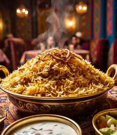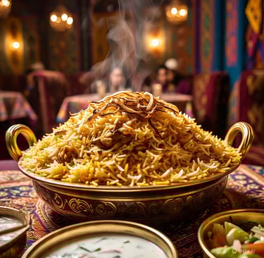 Rich flavors of authentic Hyderabadi Dum Biryani, a royal dish slow-cooked with aromatic spices, tender meat, and fragrant basmati rice—bringing centuries of culinary tradition straight to your plate. A true taste of Hyderabad!